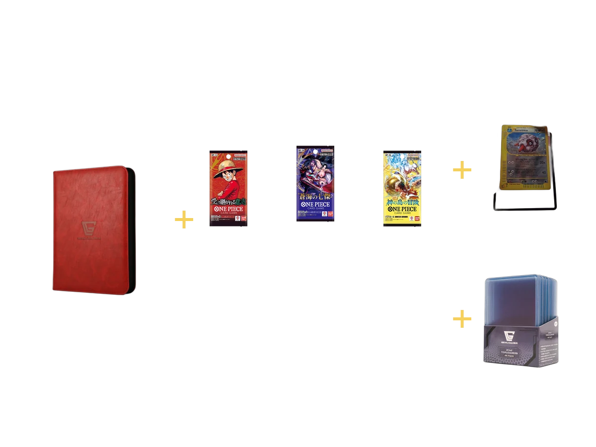 Le pack d'initiation One Piece TCG. Trois boosters de nos derniers drops pour sentir l'ouverture, un binder Gemloader pour commencer à classer, et le kit de protection minimum pour sécuriser tes premières rares.